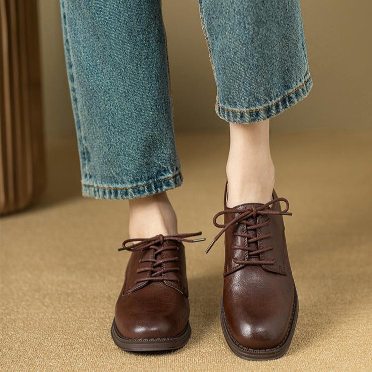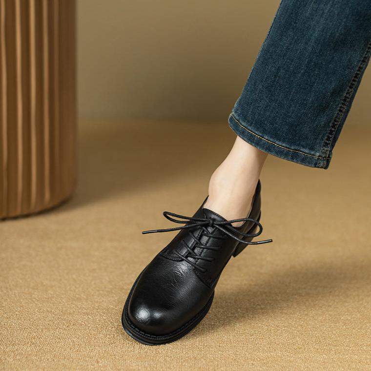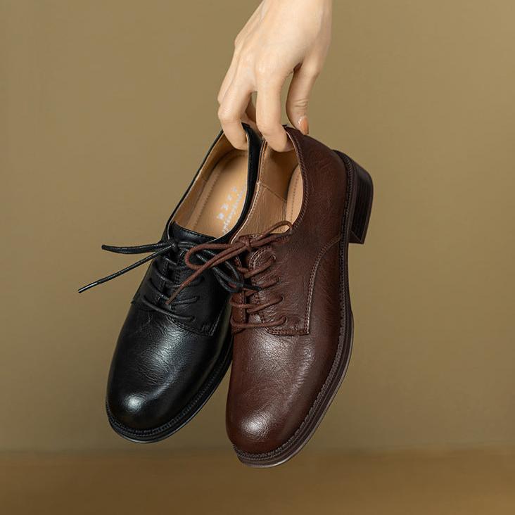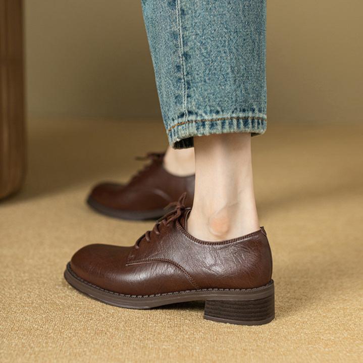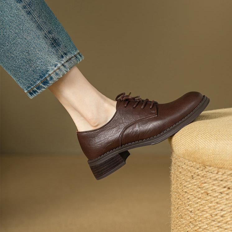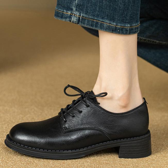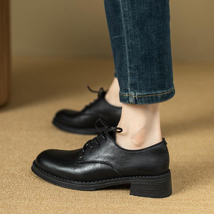 Handmade British style Round Toe Lace Up Leather Chunky Heeled Loafers