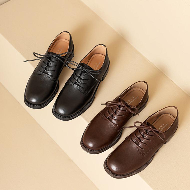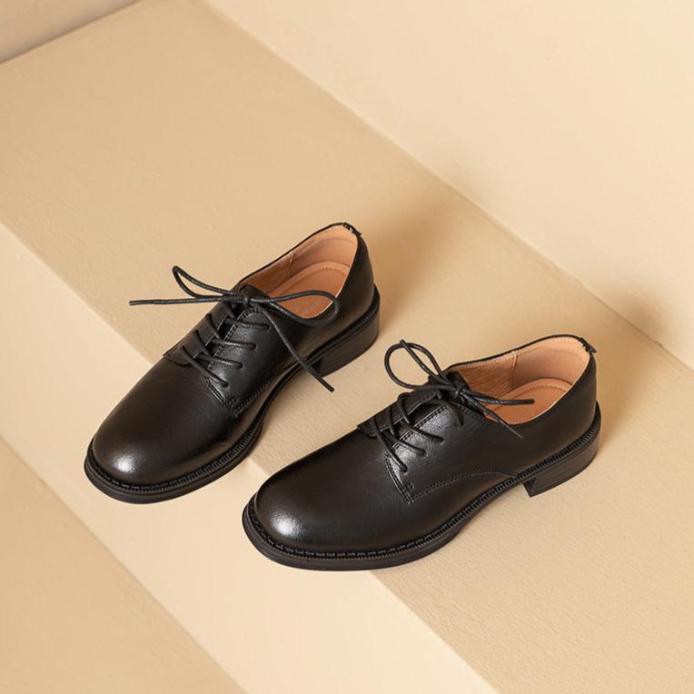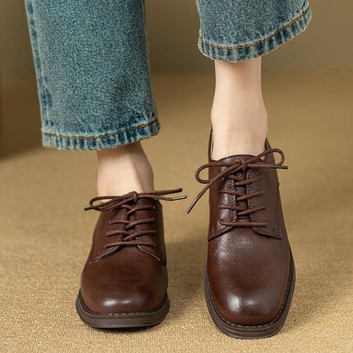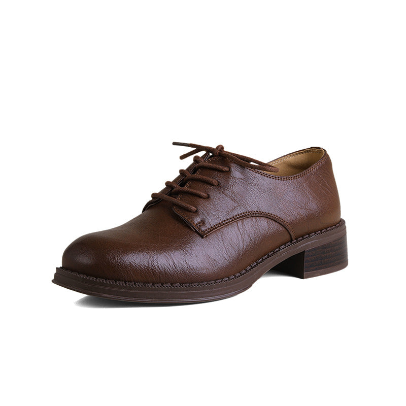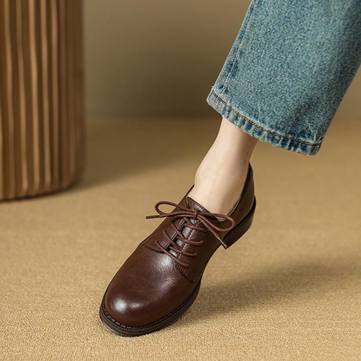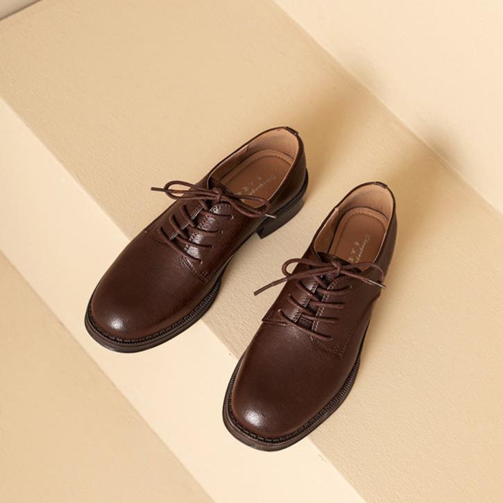 Handmade British style Round Toe Lace Up Leather Chunky Heeled Loafers