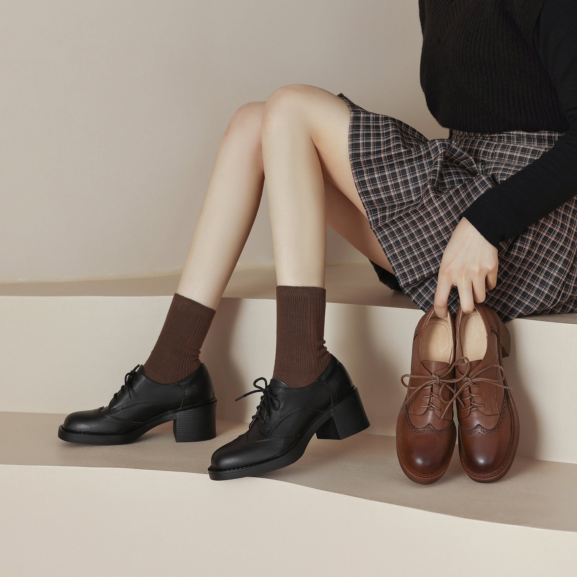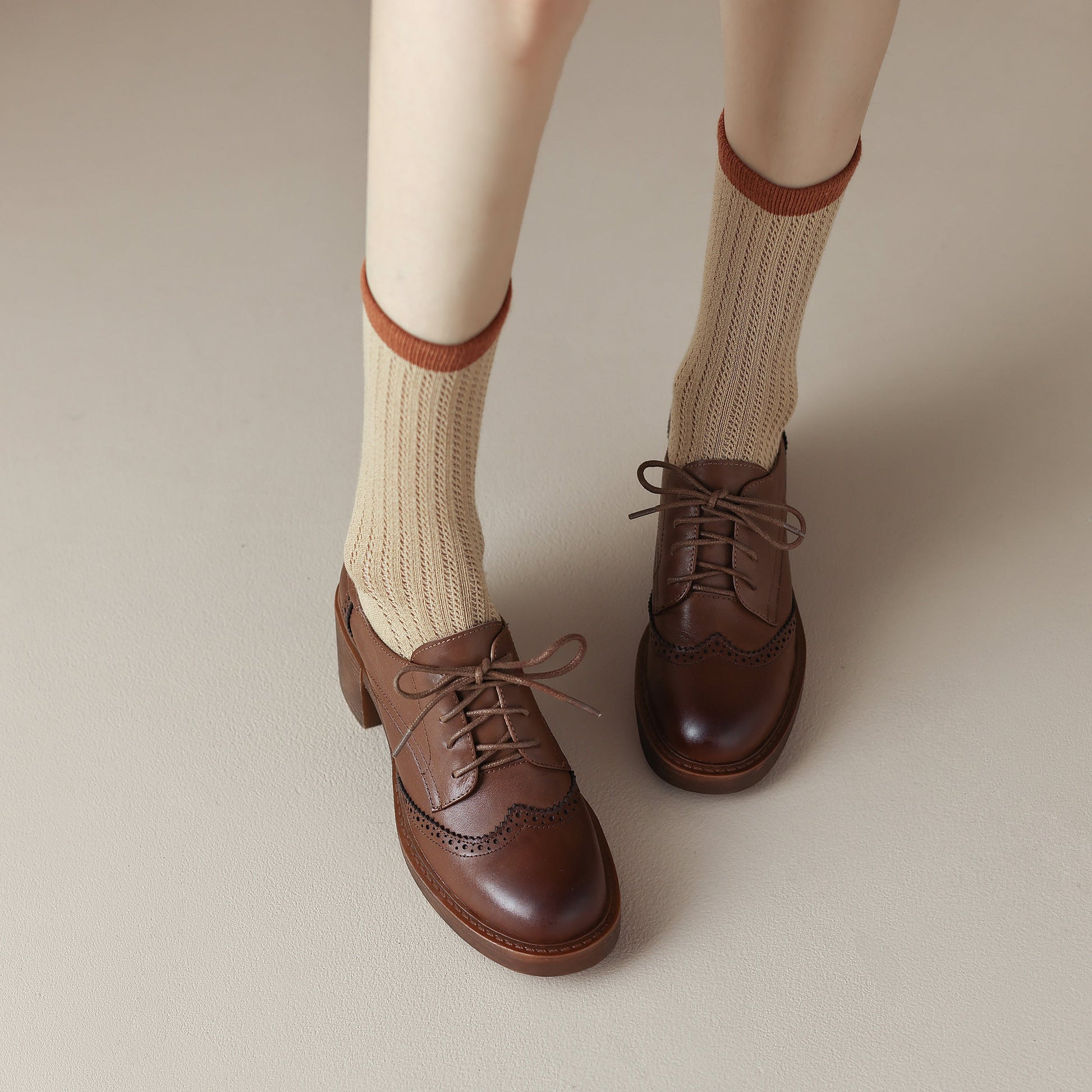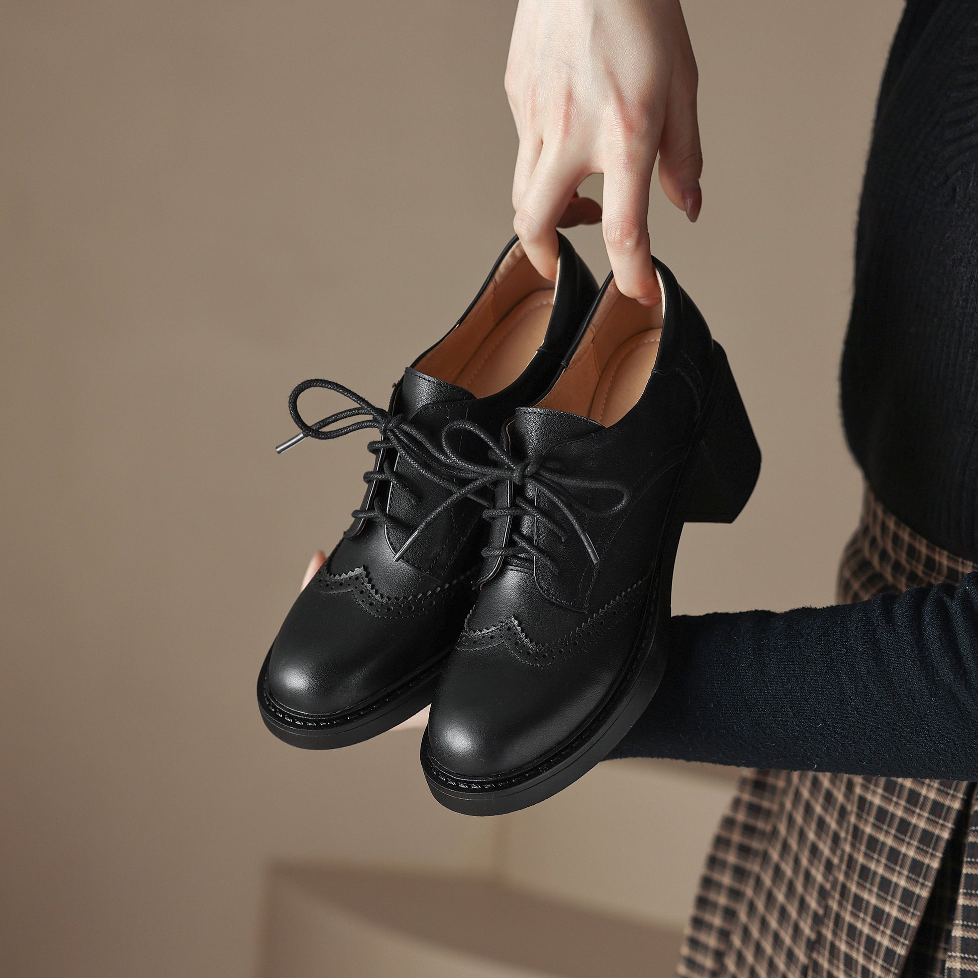Handmade High Chunky Heel Leather Brogues Womens Shoes