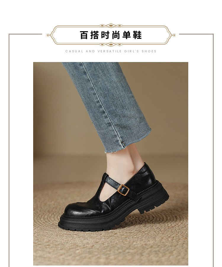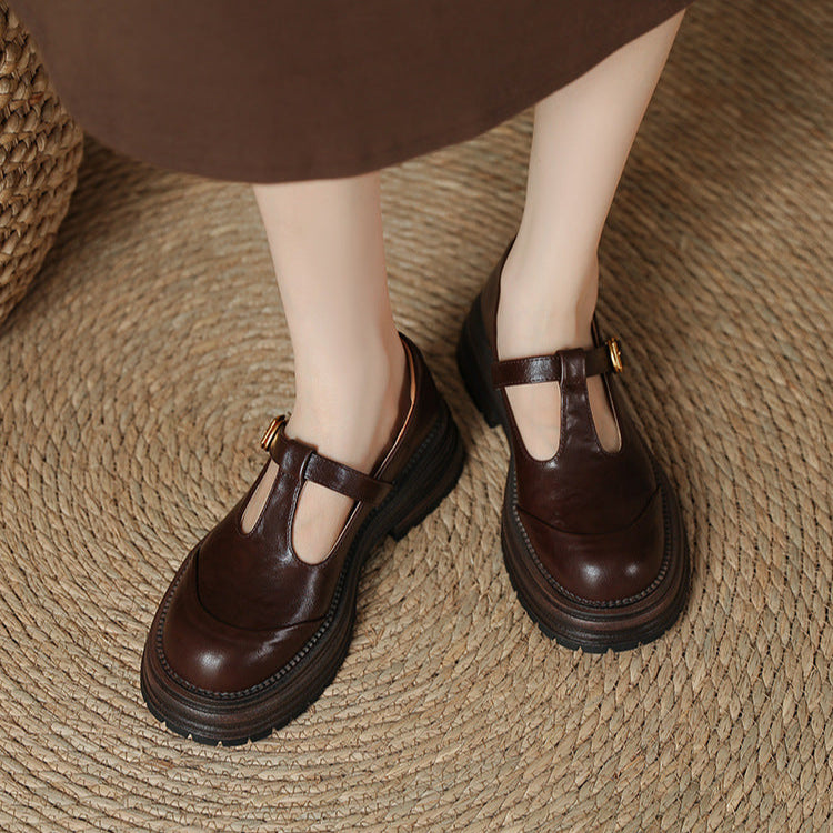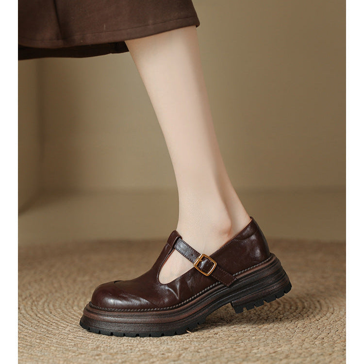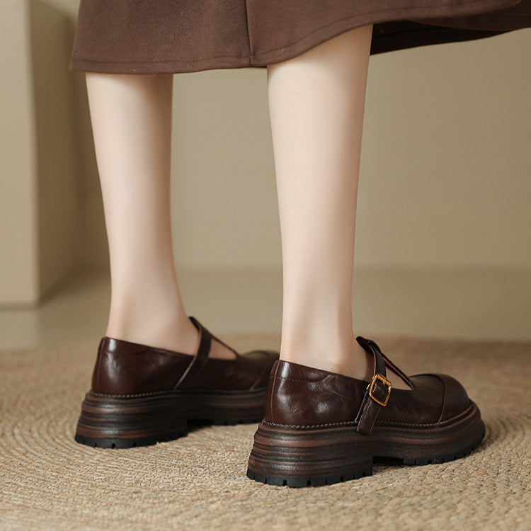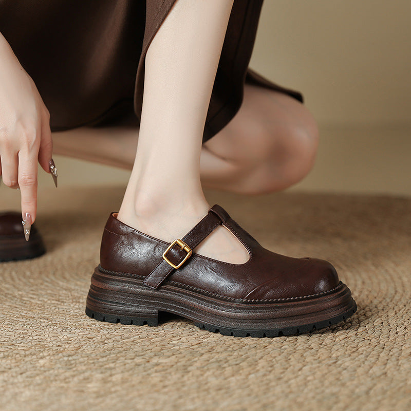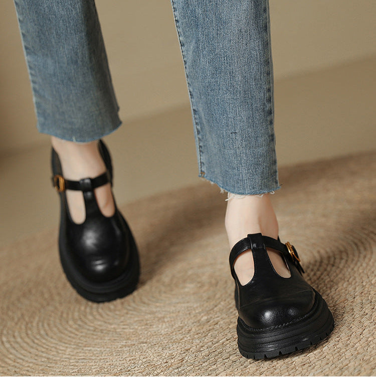 T-Buckle Platform Leather Comfortable Low Heel Women's Shoes