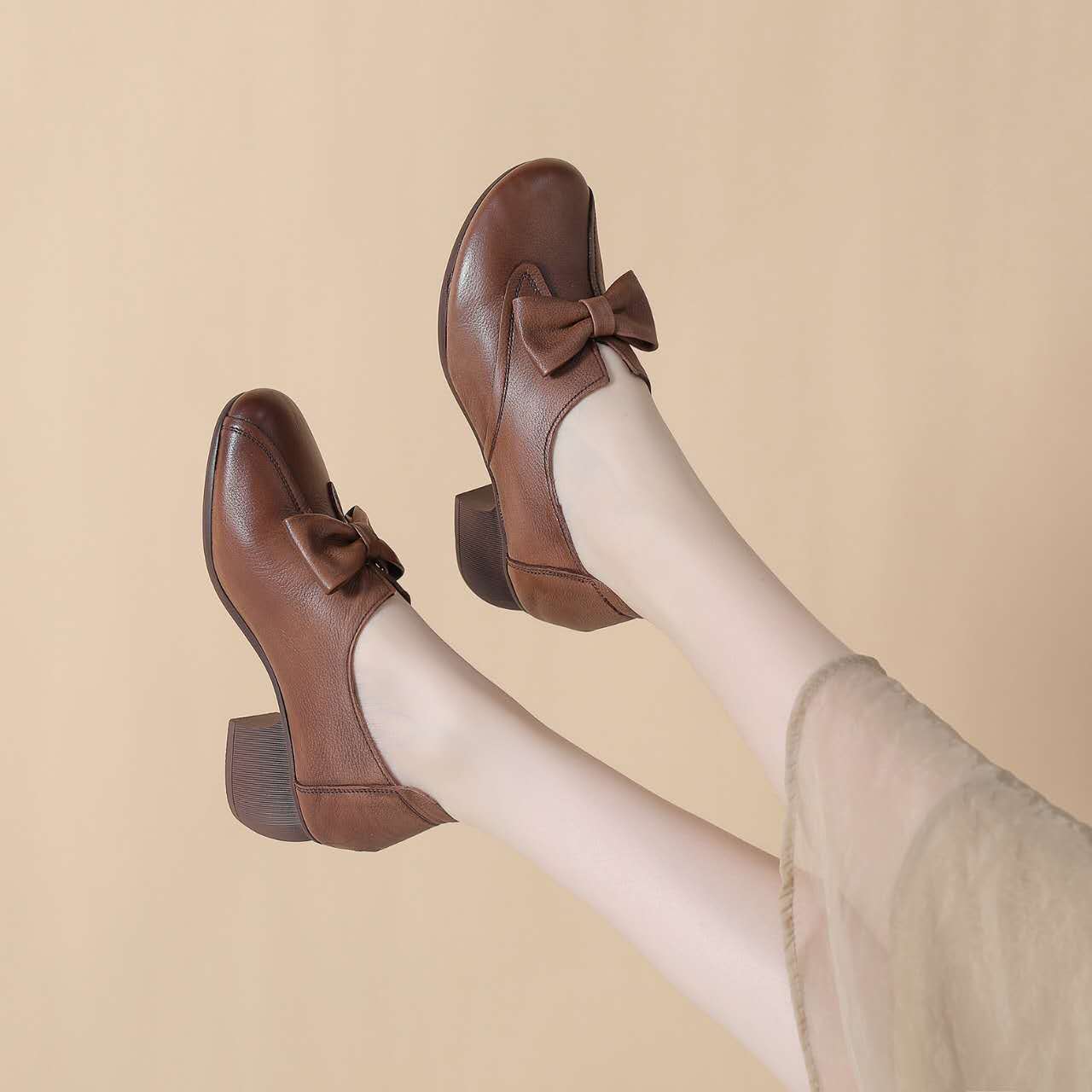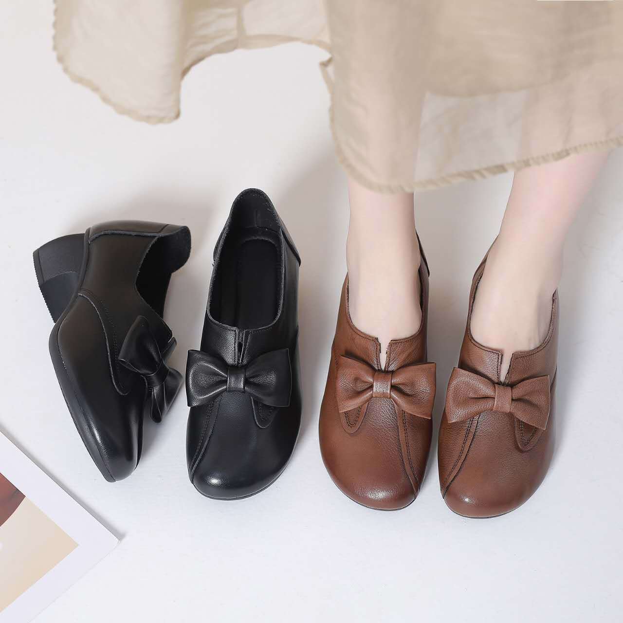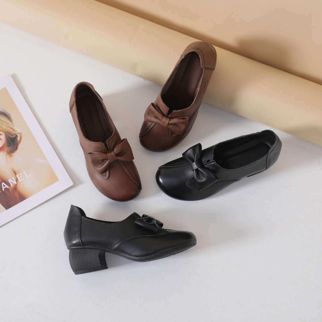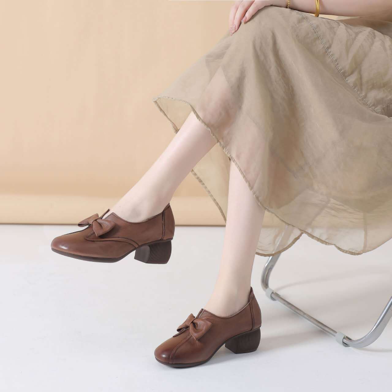 Women Genuine Leather Ethnic Style Head Layer Cowhide Retro Chunky Heel Shoes