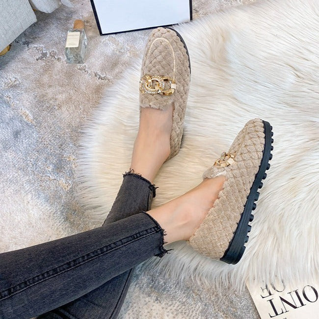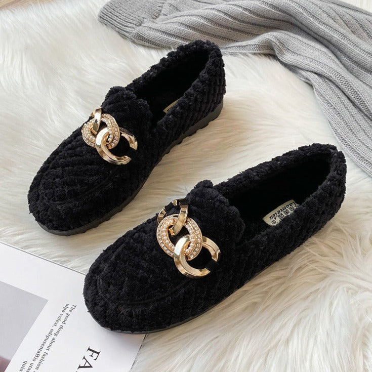 Women Faux-Fur Loafers Metal Chain Winter Warm & Comfortable Plush Shoes