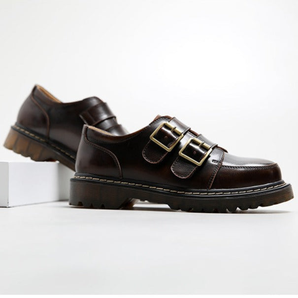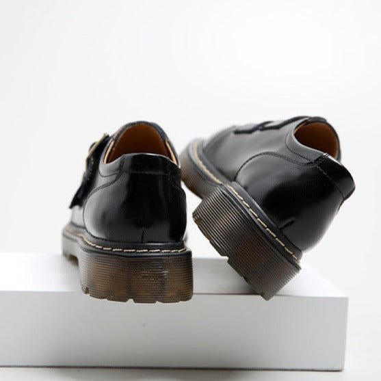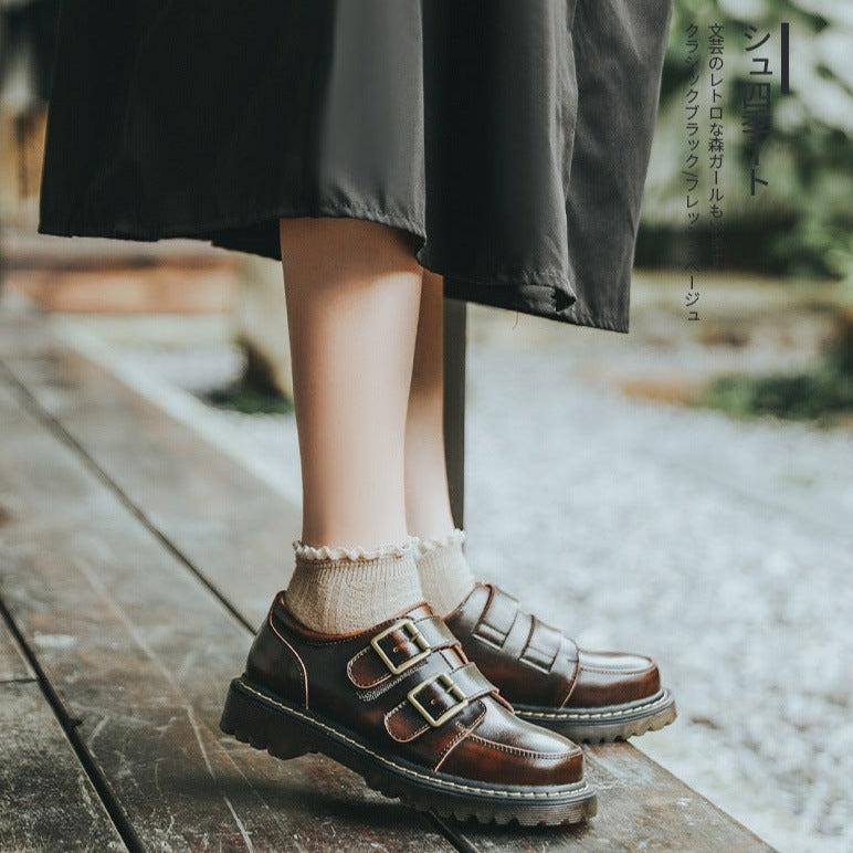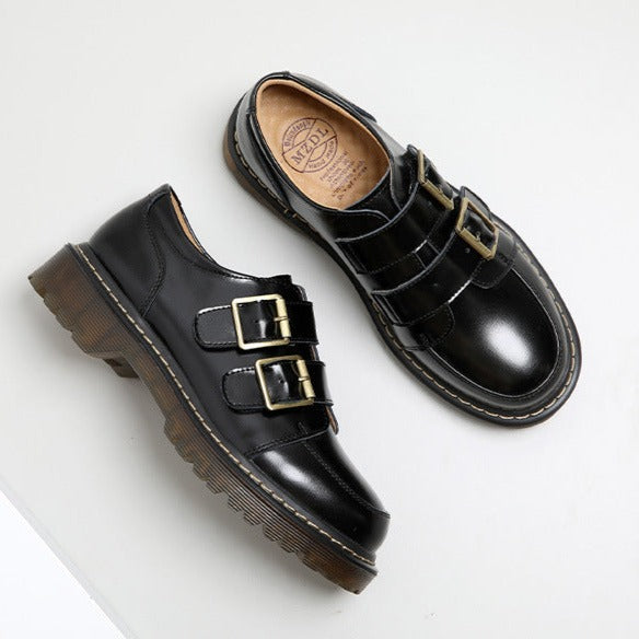 This stylish. contemporary shoe features two metal buckle and round toe design to make any outfit look sleek and sophisticated. The leather upper ensures durability and long-lasting comfort for all-day wear. Perfect for work or leisure. the Women Retro Round Head Metal Buckle Leather Flat JK Loafers is an essential addition to your wardrobe.