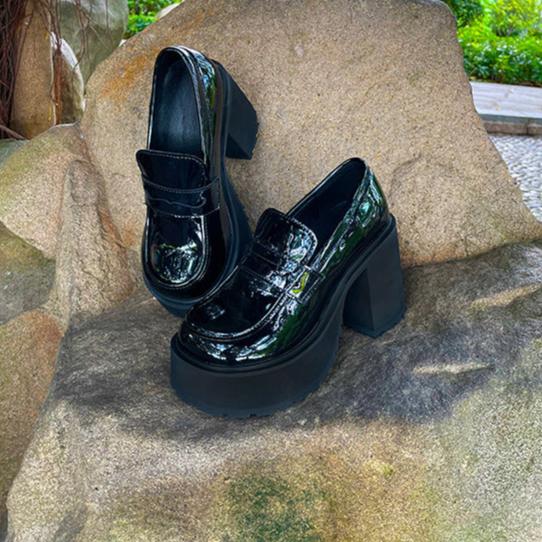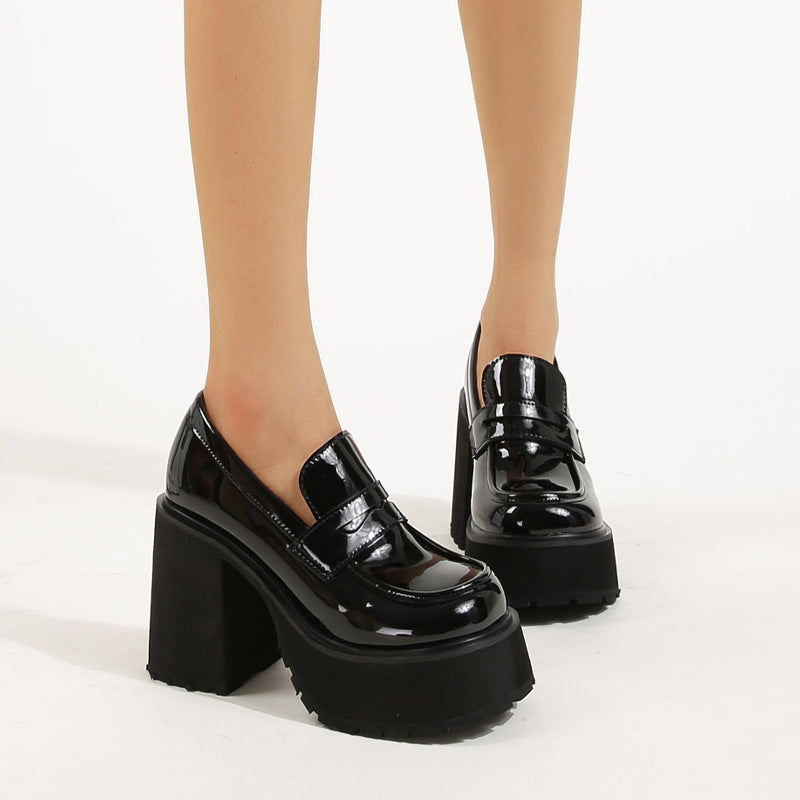 Womens Chunky Platform High Heeled Patent Leather Loafers