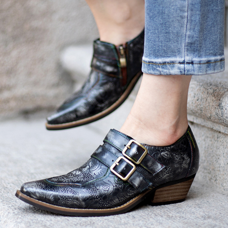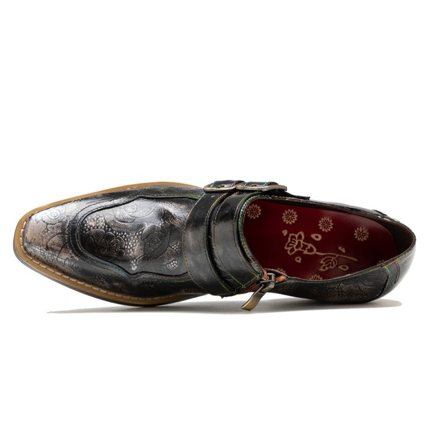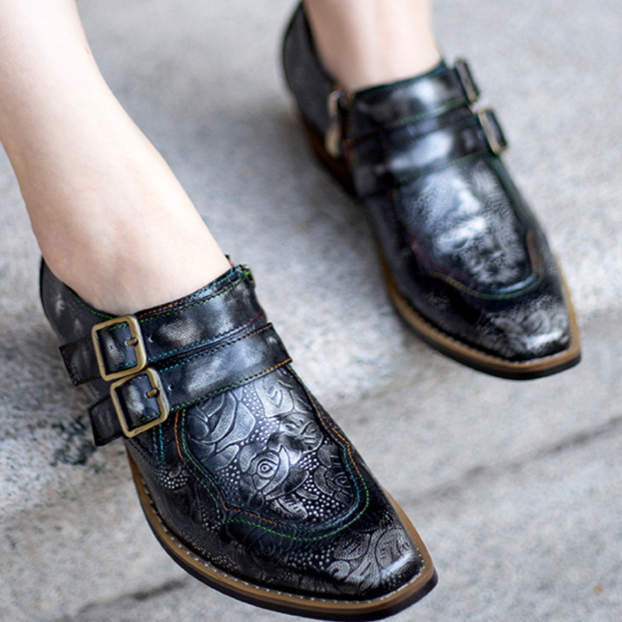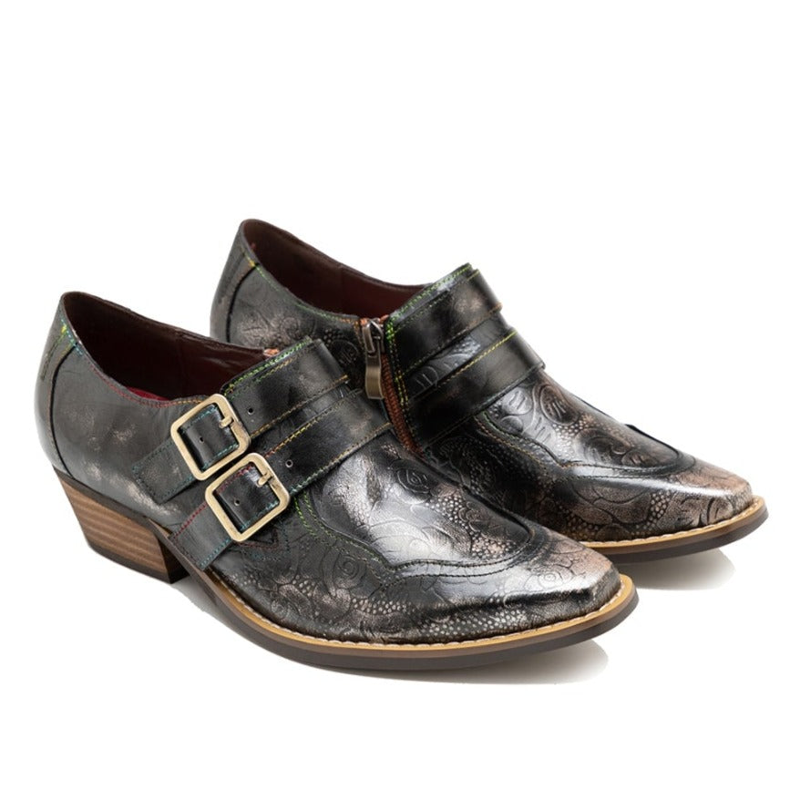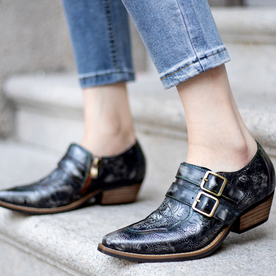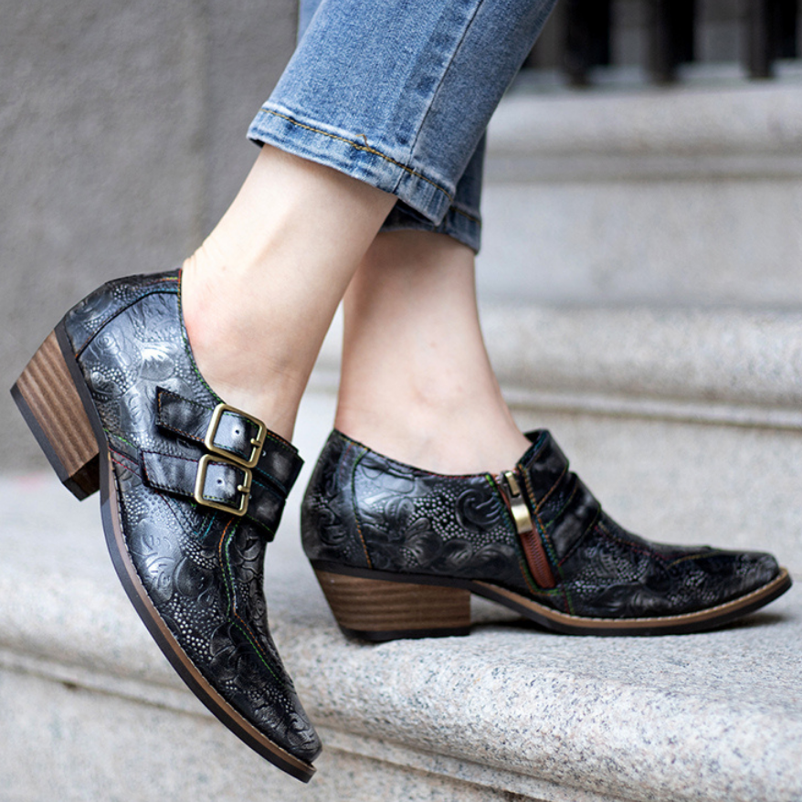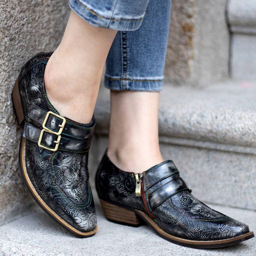Look like a fashionista in these Womens Floral Embossed Leather Zipper Belt Buckle Oxford Shoes. made with high-quality leather and embossed with a floral design. Features include a zipper. belt buckle. and Oxford shoe style. perfect for any occasion.