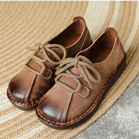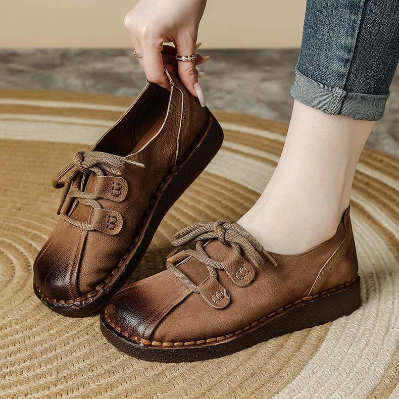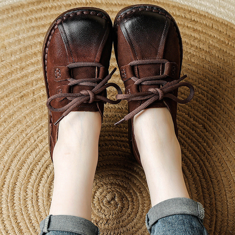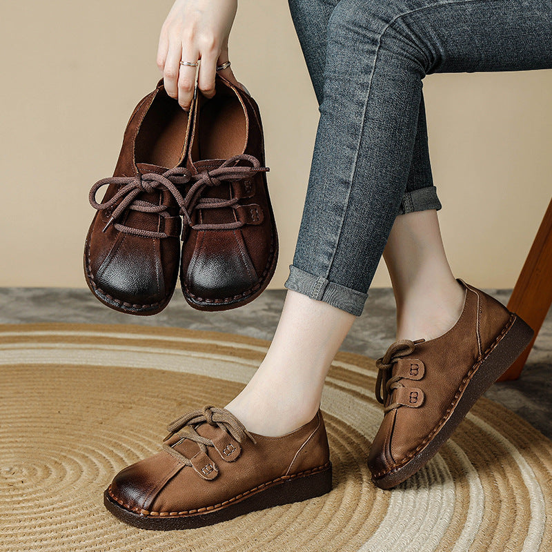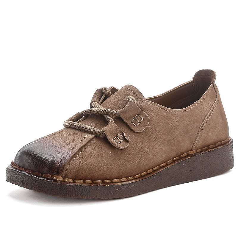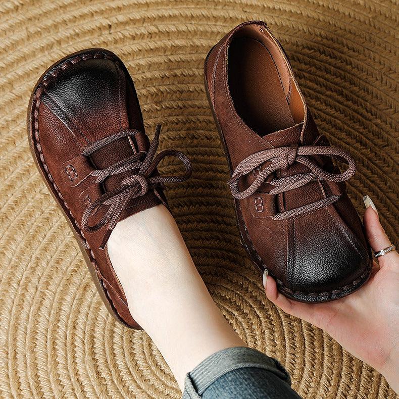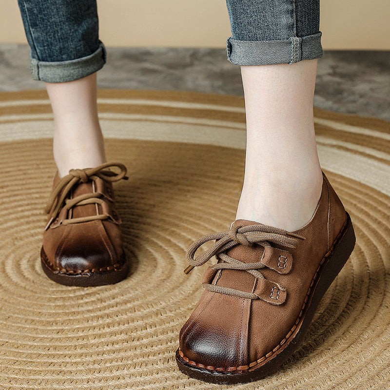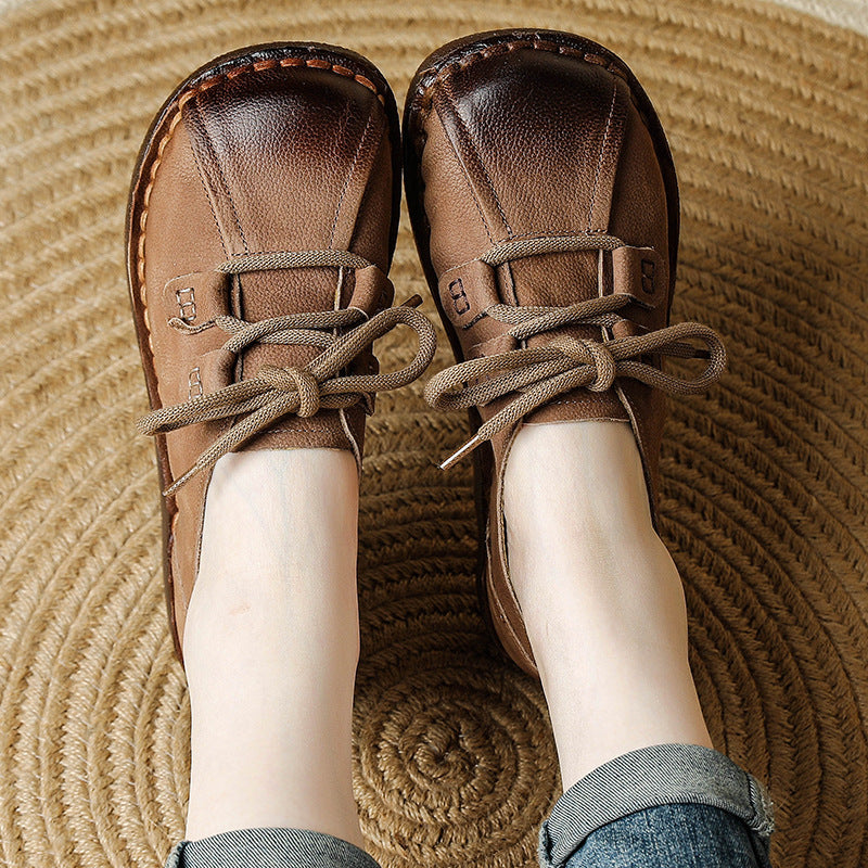 Women's Head Layer Cowhide Leather Soft Sole Casual Lace Up Flat Shoes