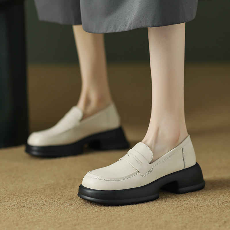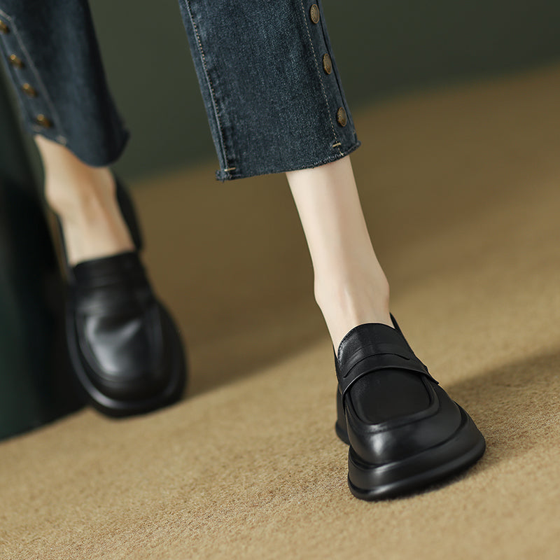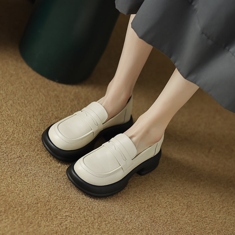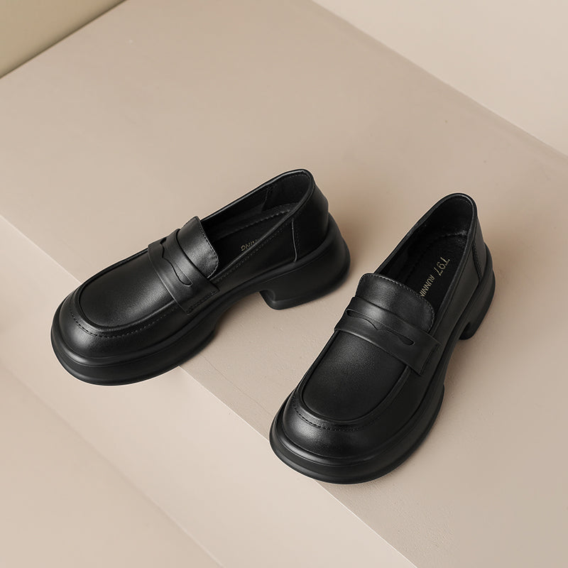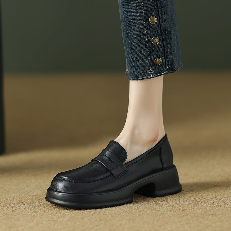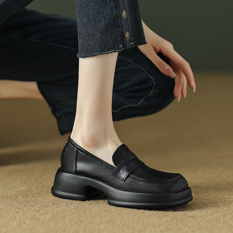 Womens Platform Leather Round Toe Block Heels Loafers Shoes