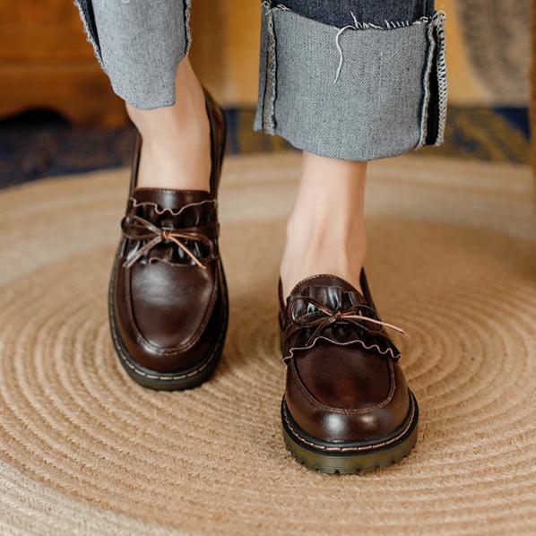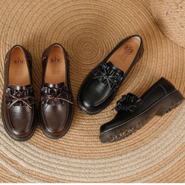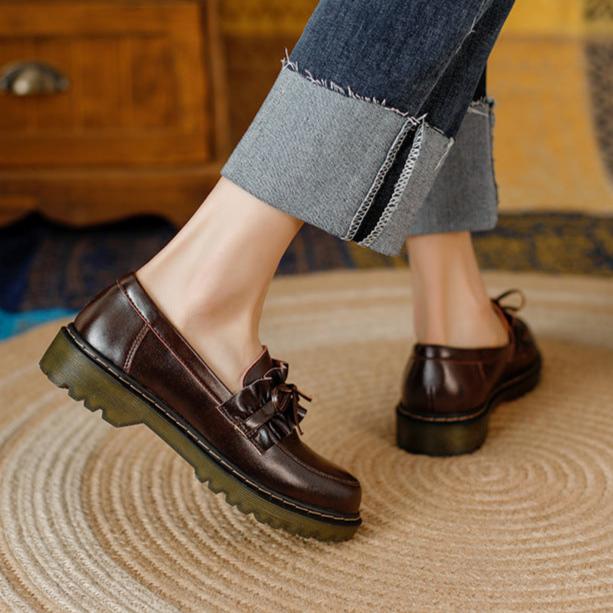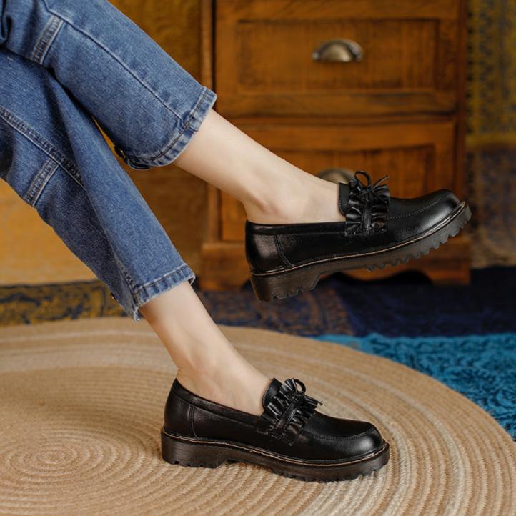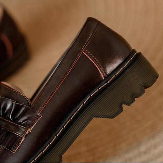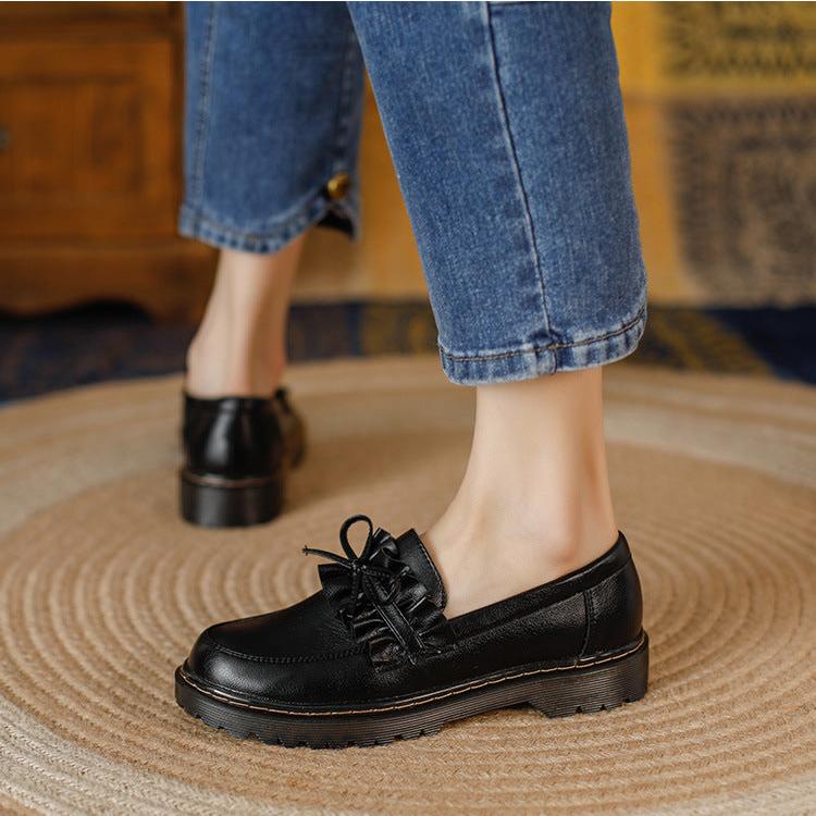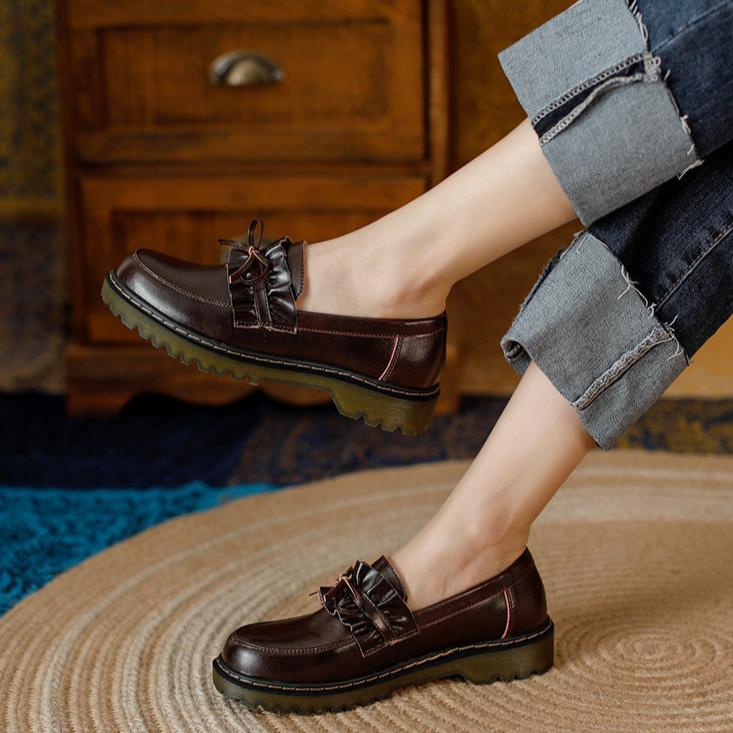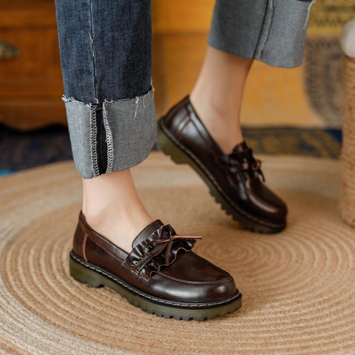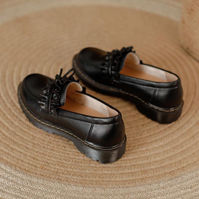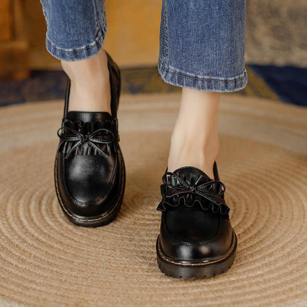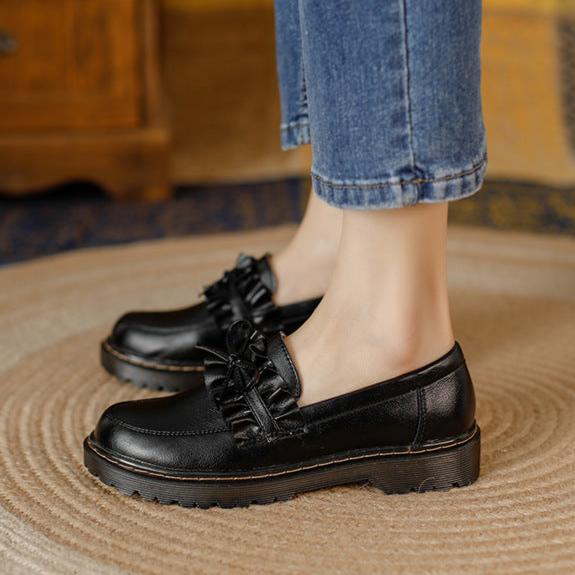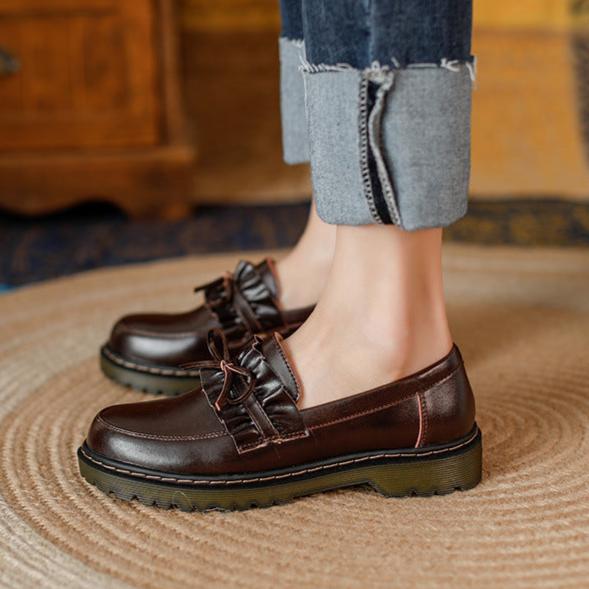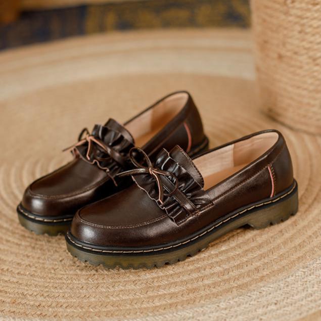 Womens Round Toe Leather Bow Ruffled Ruffle Trim Loafers